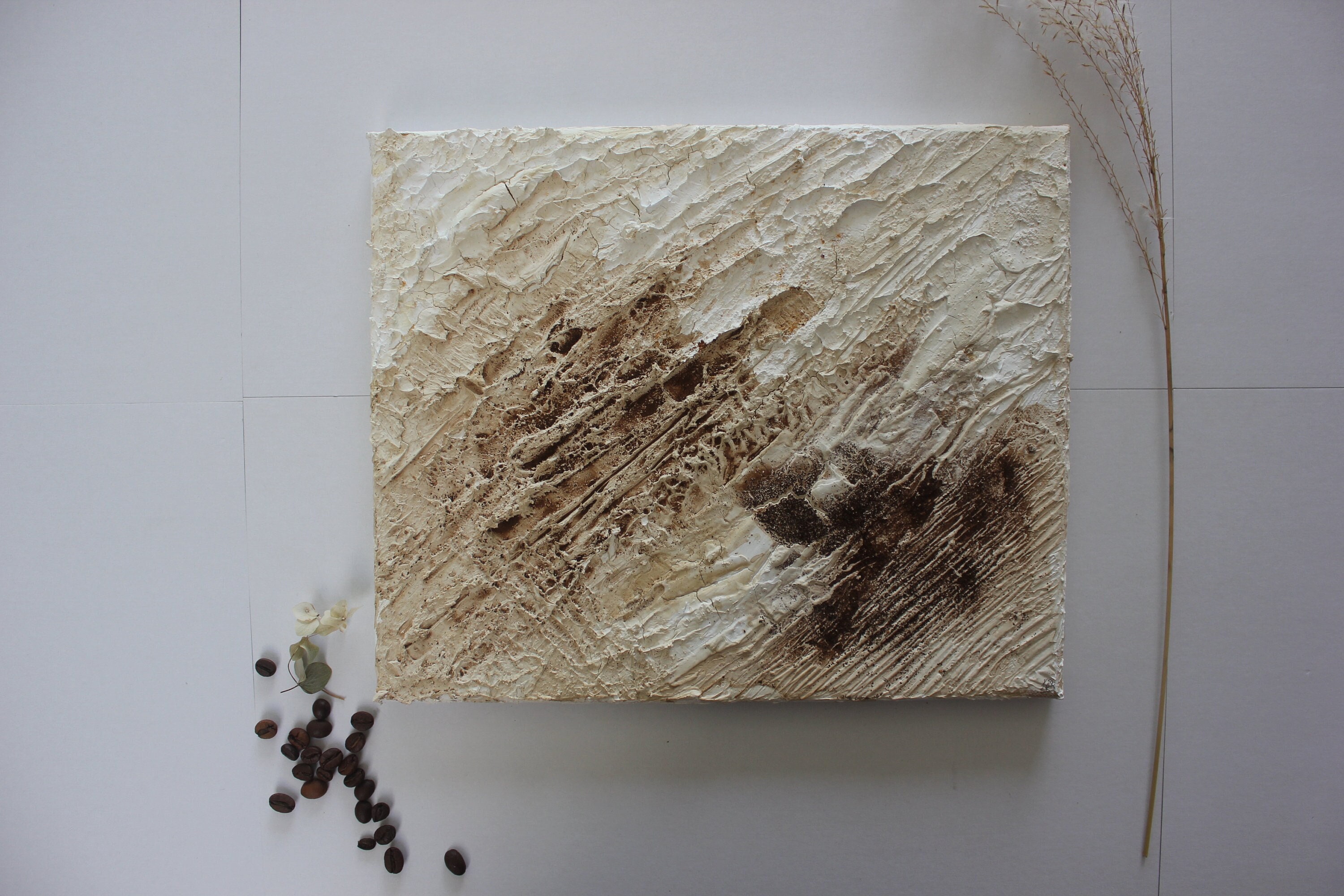 Natürliches Boho-Wandbild mit 3D-Struktur aus Kaffeesatz – handgemalt auf Bio-Leinwand (30 × 25 cm). Jedes Stück ein Unikat! Perfekt als Geschenk oder stilvolles Statement für dein Zuhause.